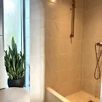 La villa Thatched Country Escape - Aarhus dispone de un cuarto de baño con un inodoro separado y ducha. Los secadores de pelo, la secadora y las toallas de baño también garantizan una experiencia cómoda.